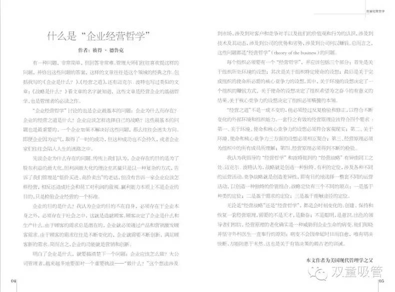 首先,《雙童經(jīng)營哲學》的開篇,就是美國現(xiàn)代管理學之父彼得德魯克所寫的《什么是“企業(yè)經(jīng)營哲學”》,通過他的講解闡述,使我們明白企業(yè)經(jīng)營哲學的重要性。