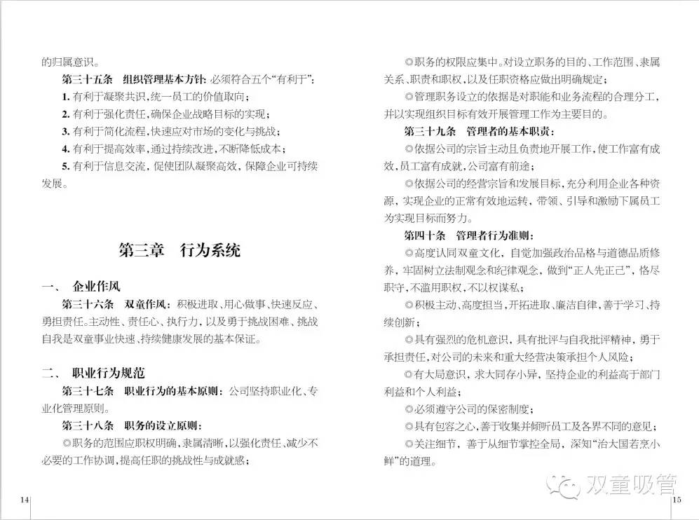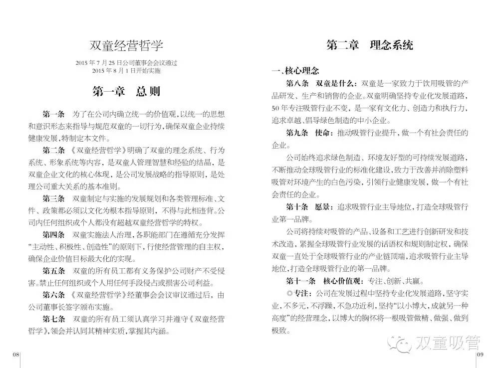 在《雙童經(jīng)營哲學》中,共分為五章內(nèi)容,分別為總則、理念系統(tǒng)、行為系統(tǒng)、繼任者培養(yǎng)、文化修訂。不論是企業(yè)的哪些行為,都可以從中找到依據(jù)和準則。