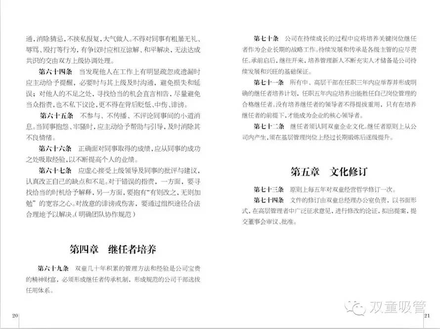 而這本《雙童經(jīng)營哲學》并不是一成不變的,在最后一章中,它規(guī)定每五年都要對《雙童經(jīng)營哲學》進行重新修訂。它必須通過反復(fù)的檢驗和修正,以符合不斷變化的外部環(huán)境和組織能力。