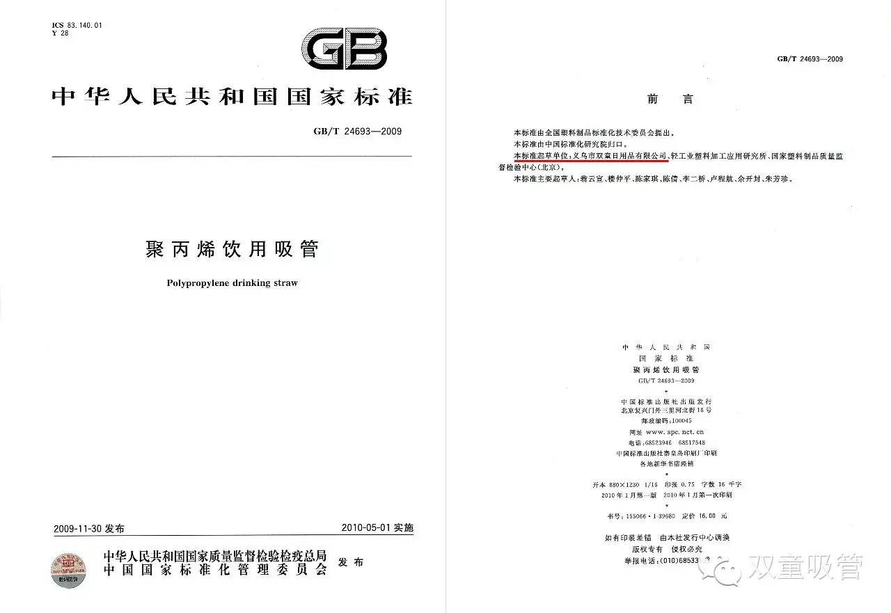 由雙童吸管起草發(fā)布的《聚丙烯飲用吸管》國(guó)家標(biāo)準(zhǔn)文件