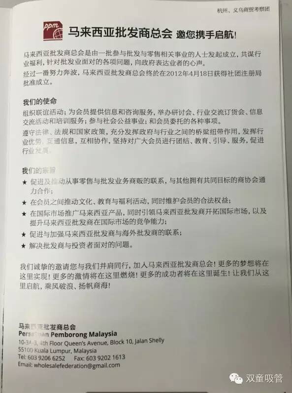 馬來西亞批發(fā)商總會(huì)是由一批參與批發(fā)與零售相關(guān)事業(yè)的人士發(fā)起成立的組織,此次來義烏,是該會(huì)成立3年以來,第一次組織商貿(mào)考察團(tuán)出國考察,希望能夠深入了解杭州市場概況,同時(shí)也積極參與我們義烏的第21屆義博會(huì)。