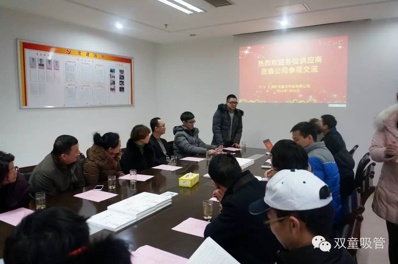 本周二,我們雙童邀請了雙童的大部分供應商們來到雙童,一起開展了一個溝通交流會,對今年的工作進行總結(jié)及交流。供應商們也在總經(jīng)理李二橋和銷售副總朱芳珍的陪同下先后參觀了與他們自身工作有關(guān)聯(lián)的幾個部門及區(qū)塊,如樣品間、車間、倉庫等。