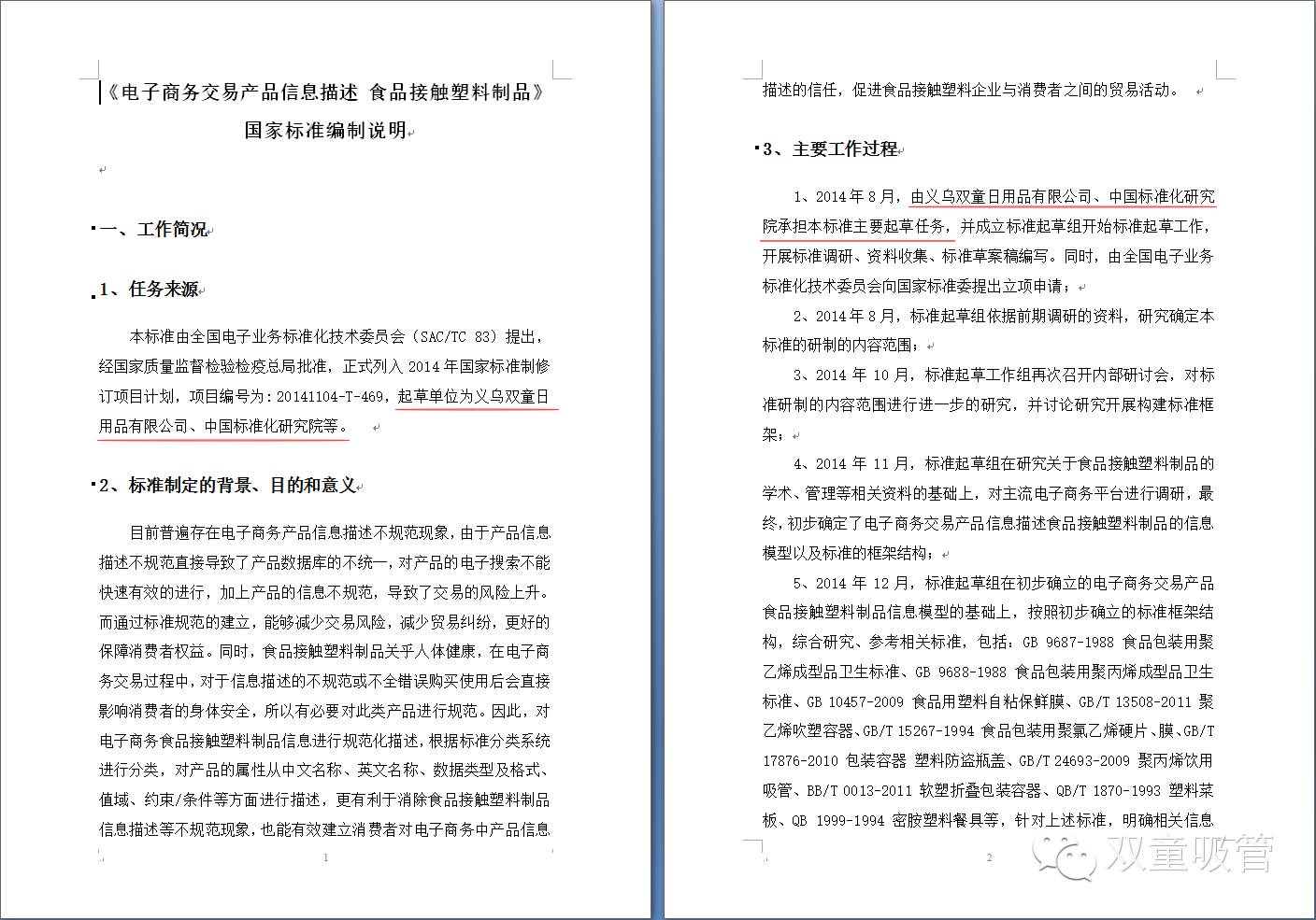 2013年,雙童推動編制起草了《聚乳酸冷飲吸管》國家行業(yè)標準。2014年,由雙童主持并起草的《食品接觸塑料制品電子商務(wù)交易信息規(guī)范》國家標準工作正式立項申報,為中小企業(yè)參加國家標準化起草工作樹立了一個新的標桿。