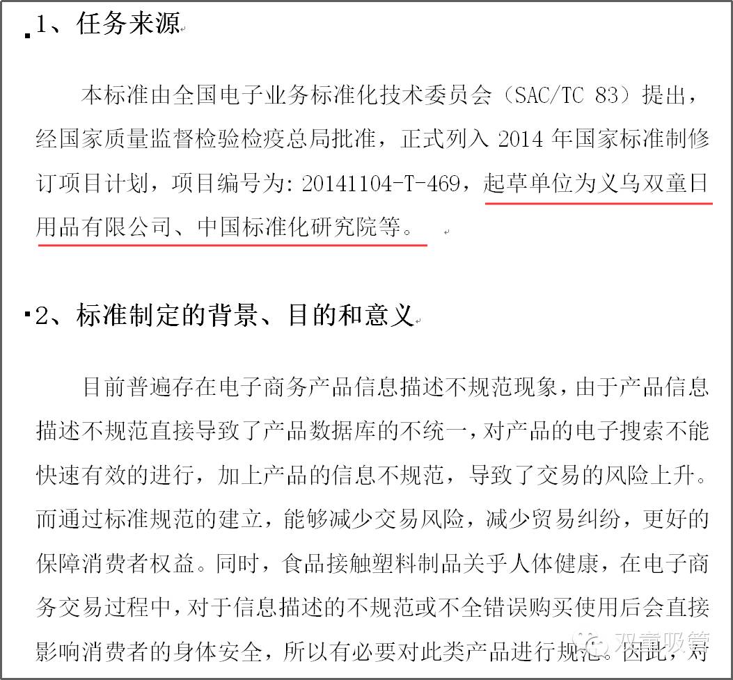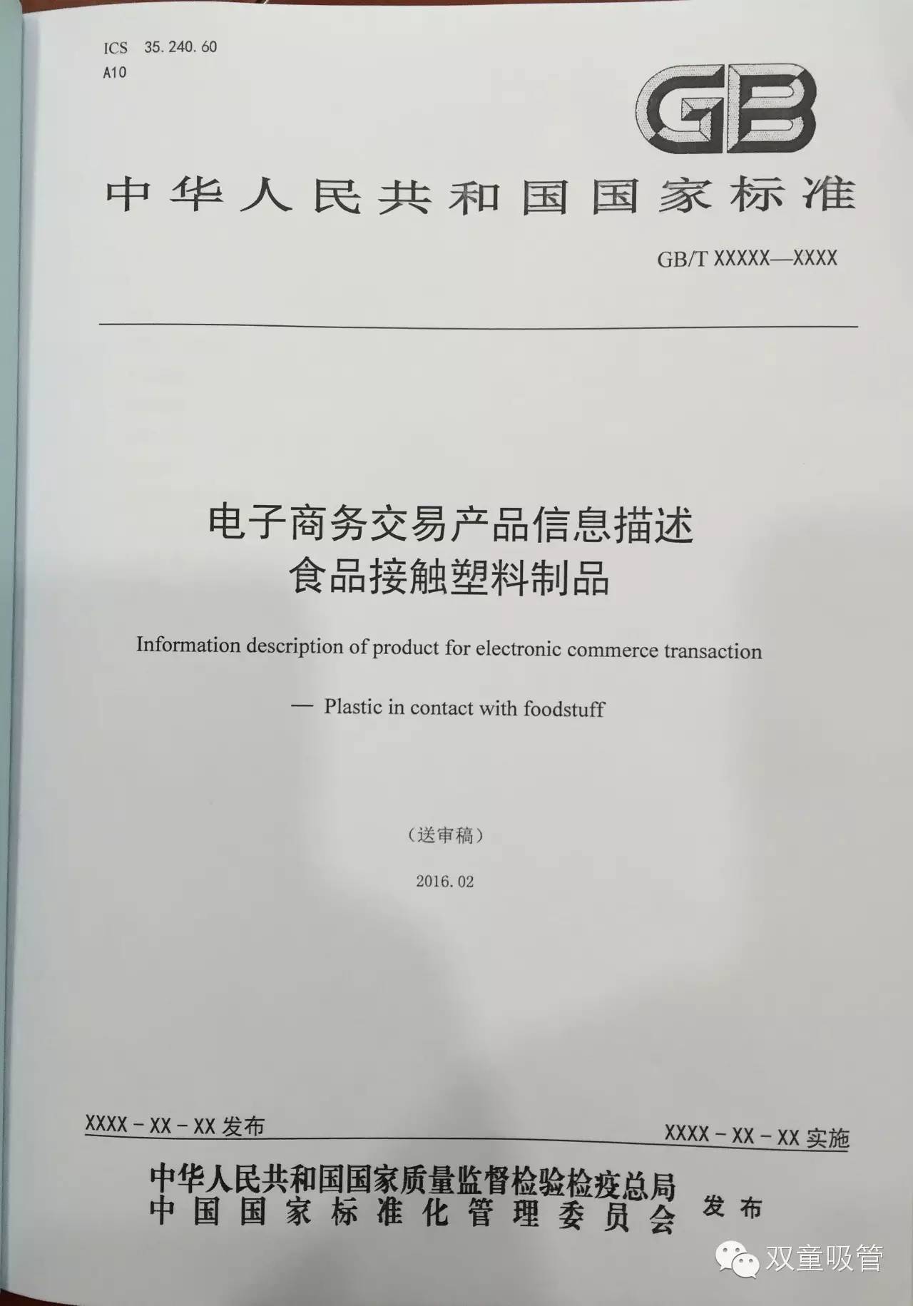 由全國電子業(yè)務(wù)標準化技術(shù)委員會(SAC/TC 83)提出,經(jīng)國家質(zhì)量監(jiān)督檢驗檢疫總局批準,由“雙童吸管”作為標準第一起草單位,會同中國標準化研究院于2016年3月2日在北京中國標準化研究院舉行《電子商務(wù)交易產(chǎn)品信息描述 食品接觸塑料制品》國家標準審定工作。