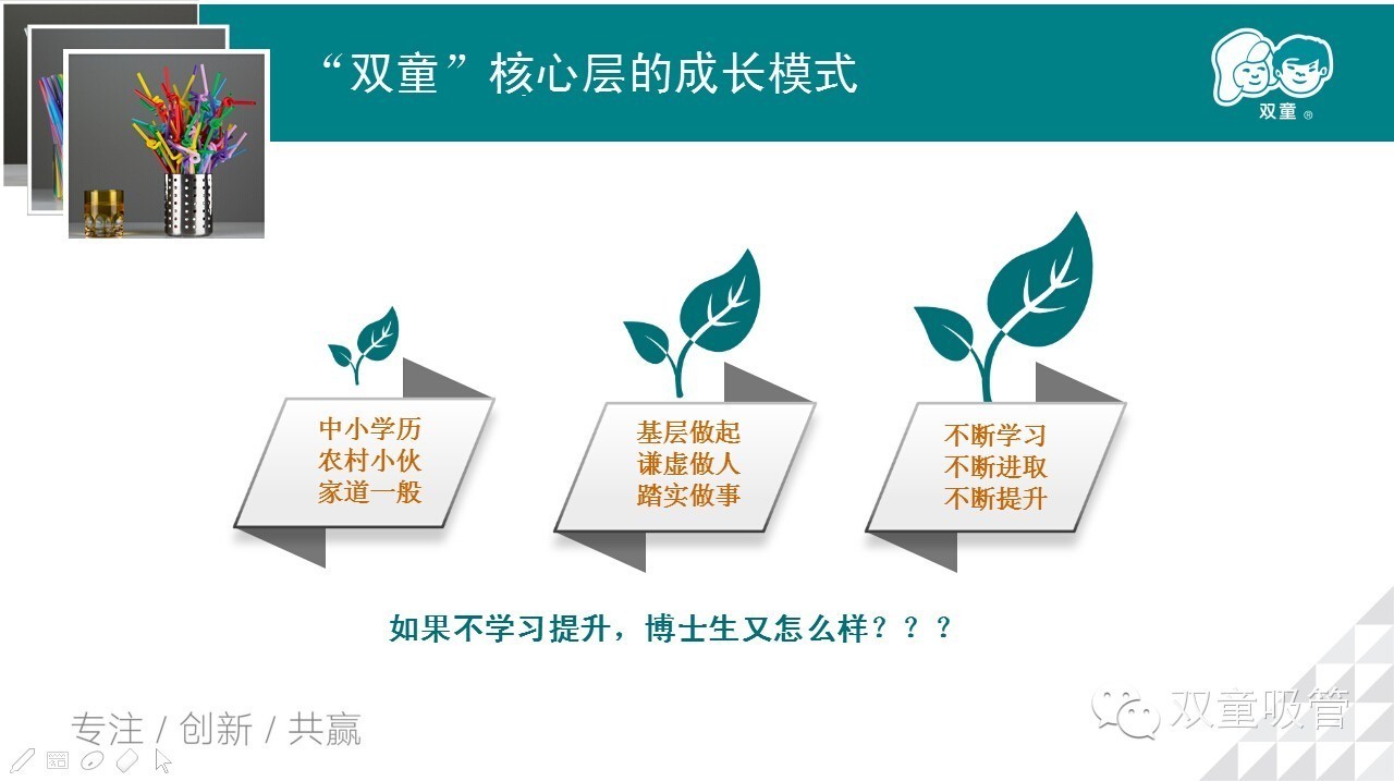 而為了增強(qiáng)說(shuō)服力,當(dāng)家人還舉了不少雙童人自己的例子。從普普通通的一個(gè)員工開(kāi)始做起,一步步提升進(jìn)步,穩(wěn)扎穩(wěn)打,在雙童實(shí)現(xiàn)了事業(yè)家庭的夢(mèng)想的人不在少數(shù)!樓總說(shuō),我們的李總、廠長(zhǎng)、車(chē)間主任等等,都是我們身邊最鮮活的例子!他們不僅在雙童升職加薪,還在雙童泡妞生娃呢!