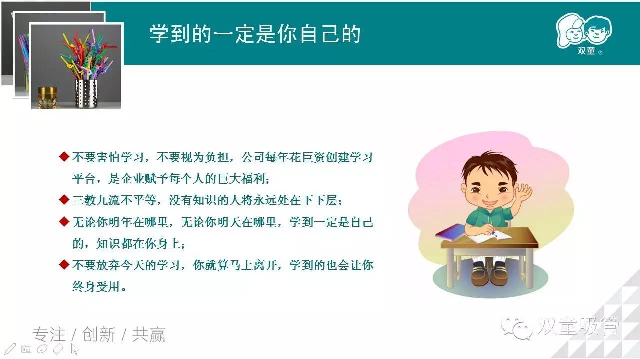 當(dāng)家人樓總勉勵(lì)大家,一定要堅(jiān)持學(xué)習(xí),學(xué)習(xí)并不是學(xué)校里才需要做的事!如果工作以后就不思進(jìn)取,不學(xué)習(xí)提升,就算是博士生,雙童也不會(huì)對(duì)你敞開(kāi)大門(mén)!而對(duì)于那些肯學(xué)習(xí)、肯鉆研的員工,雙童會(huì)提供非常多的學(xué)習(xí)機(jī)會(huì)和提升空間,讓你在雙童有一個(gè)更好的發(fā)展!就算有一天你離開(kāi)了雙童,你學(xué)到的始終是你自己的!真摯的話語(yǔ)深深地感染了在座的員工們,相信以后雙童的學(xué)習(xí)氛圍會(huì)更好!