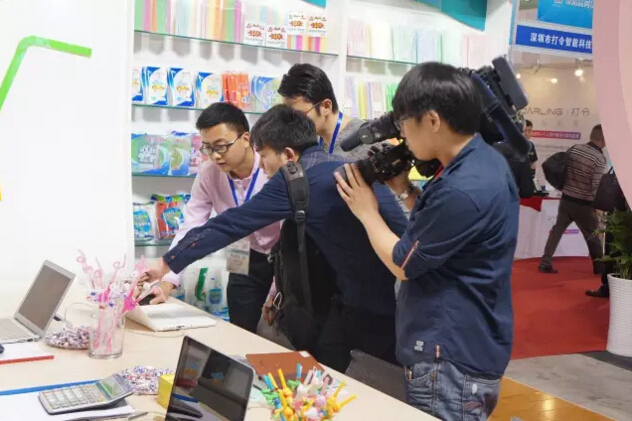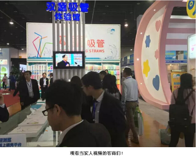 經(jīng)過雙童經(jīng)過的客商基本都會(huì)留下腳步。原來是雙童展位的正中央掛著一臺(tái)大尺寸的電視機(jī),不間斷的滾動(dòng)播放當(dāng)家人接受的各類節(jié)目采訪,以及各類媒體對(duì)雙童吸管進(jìn)行報(bào)道的視頻!看來咱們當(dāng)家人的魅力還真是大呀!