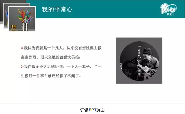 樓總認(rèn)真地準(zhǔn)備了PPT,講述了他的“匠人”之心。從早期創(chuàng)業(yè)過程的搖擺不定談到雙童吸管發(fā)展的堅(jiān)定;從開始的規(guī)?;笈可a(chǎn)講到差異化和品牌化經(jīng)營,從小商思維談到經(jīng)營哲學(xué);他回顧了雙童吸管二十多年的發(fā)展歷程,講到了他所推崇和堅(jiān)持的“三心”,也道出了吸管大王背后的堅(jiān)守和追求。