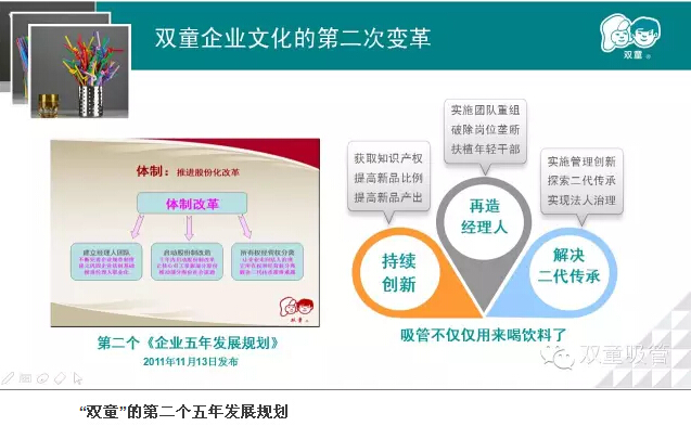 2011年,“雙童吸管”開始做第二個五年規(guī)劃,通過產(chǎn)品創(chuàng)新、團隊再造、體制改革三個方面進行發(fā)展。
