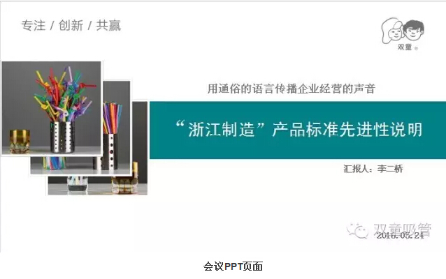 會議中,“雙童”董事長樓仲平向各位領(lǐng)導(dǎo)闡述了“雙童”一直以來對標(biāo)準(zhǔn)化工作的重視,并是目前浙江省唯一由單一企業(yè)承擔(dān)行業(yè)標(biāo)準(zhǔn)、國家標(biāo)準(zhǔn)和國際標(biāo)準(zhǔn)起草編制任務(wù)的中小企業(yè)。總經(jīng)理李二橋則詳細(xì)地向各位領(lǐng)導(dǎo)介紹了聚丙烯吸管的標(biāo)準(zhǔn)初案、編制說明(包括標(biāo)準(zhǔn)對比、分析、驗(yàn)證、說明材料)及先進(jìn)性介紹。