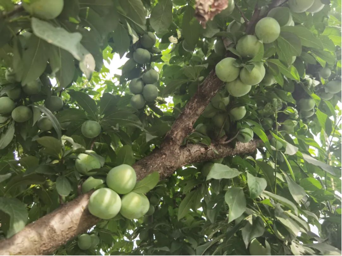 魚塘旁邊的李子樹也不負眾望,在水邊因為沒有其他高大樹木的遮擋,光照充足,有了絕佳的生長機會,看這些李子個個長得快有小孩的拳頭大了,就是不知道味道怎么樣呢?