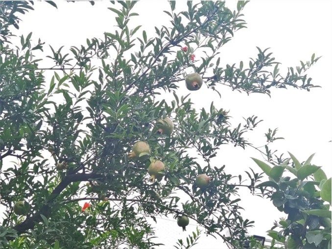 還有零星幾朵石榴花,把石榴襯得像一個個的小燈籠