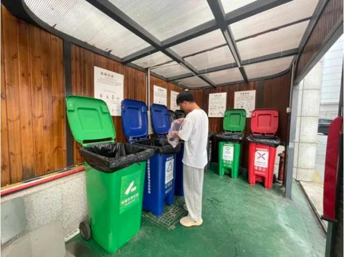 在“雙童”的垃圾投放房里各有紅綠藍(lán)黑等多個顏色的垃圾分類桶,分別將廠區(qū)的生活垃圾分為了易腐垃圾、其他垃圾、可回收物、有害垃圾四大類。