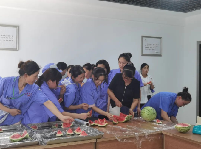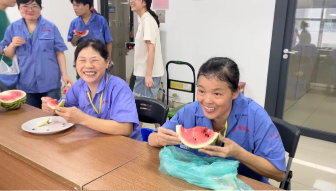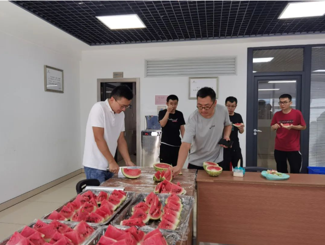 車間一線員工自然也不能落下,“雙童”總經(jīng)理李二橋親自上陣“殺”瓜,他還給大家透露,在他的安徽老家也有一片瓜田,論切西瓜,他可是專業(yè)的