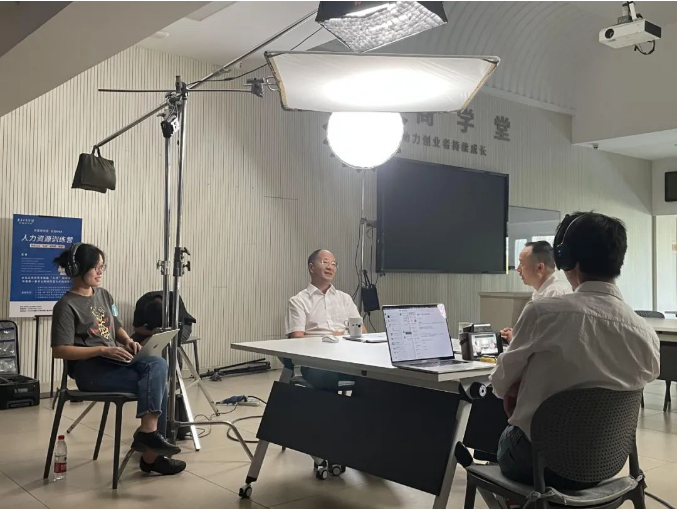 因此,攝制組對(duì)這場(chǎng)采訪十分重視,一早就來到了“雙童商學(xué)院”的授課教室搭建錄制場(chǎng)地。樓仲平也和“雙童”第二創(chuàng)業(yè)體董事長(zhǎng)張國(guó)俊一起來到采訪錄制現(xiàn)場(chǎng),與攝制組的張導(dǎo)圍坐在桌前暢談義烏市場(chǎng)的發(fā)展與同時(shí)期“雙童”的境況。