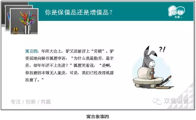 這位同學(xué)這樣說:”不光光是驢,其實(shí)我們每位員工都是需要想一想,在埋頭苦干的時候,有沒有提升自己的技能,而是原地踏步。只有不斷的進(jìn)步,才能不被社會淘汰。“