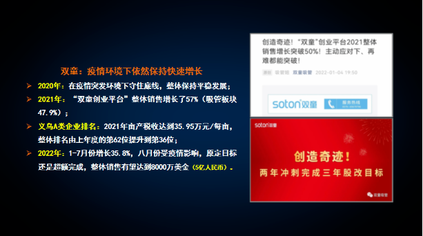 2022年度,“雙童創(chuàng)業(yè)共享平臺(tái)”各創(chuàng)業(yè)體公司板塊,年度銷售額同比增長(zhǎng)31.27%!?。?/span>