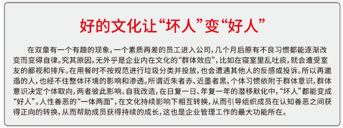 在“雙童”諸如此類的事情,其實還有很多。組織文化對員工心性的影響是直觀且深遠的,“文化文化,文以化之”,組織文化的最終效用在于一個“化”字,也就是在于讓正確的文化理念成為員工個人內(nèi)心深處的“信念”,并自覺地去執(zhí)行貫徹。