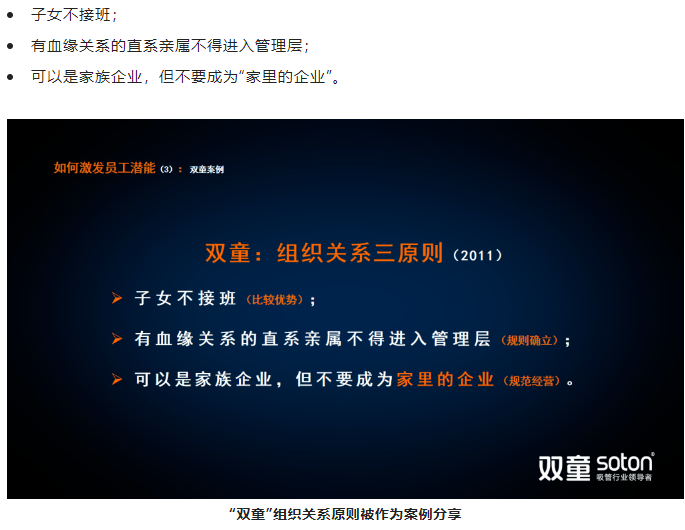 在這樣的過程中,“雙童”解決了“二代傳承”問題,也為完成組織變革打好基礎(chǔ),推動(dòng)“反熵增”破界,破除僵化的邊界,給經(jīng)理人團(tuán)隊(duì)釋放活力和信號(hào),激發(fā)大家看到可預(yù)期的成長(zhǎng)空間,繼而獲得彼此的“信任和信心”!