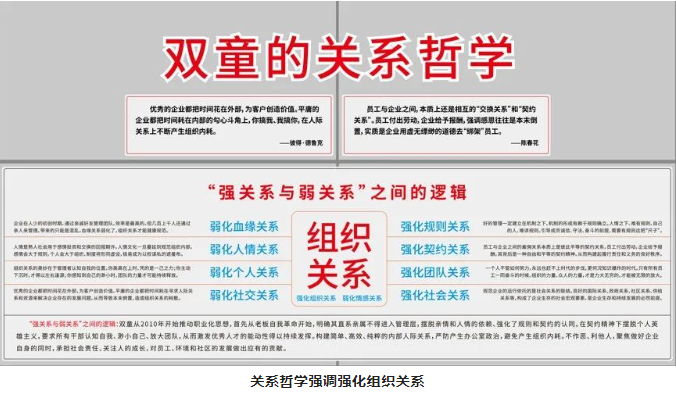 關(guān)系哲學(xué)強(qiáng)調(diào)要擺脫親情和人情的依賴、強(qiáng)化了規(guī)則和契約的認(rèn)同。在正確理解信息化環(huán)境的彼此訴求下,“雙童”也逐漸建立起科學(xué)規(guī)范的組織關(guān)系:重規(guī)則、守契約、講創(chuàng)造、論績(jī)效、同理心、共成長(zhǎng),引導(dǎo)員工向職業(yè)化思想轉(zhuǎn)變。