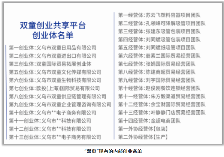 近期,金華新聞客戶端報(bào)道了“雙童”與眾不同的新模式:“把企業(yè)規(guī)模做小,把創(chuàng)業(yè)矩陣做大”(戳文末“閱讀原文”)。董事長樓仲平把“在公司內(nèi)部培養(yǎng)出五十位老板”、讓員工“共同富?!弊鳛樽约旱氖姑非?,而這些都是通過”雙童創(chuàng)業(yè)共享平臺(tái)”來實(shí)現(xiàn)的。