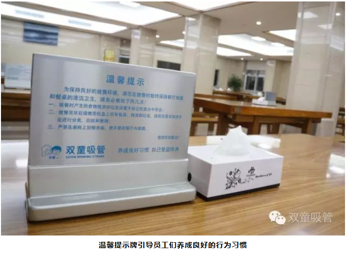 在“雙童”600余人就餐的員工餐廳里,濕垃圾也是“雙童”垃圾分類經(jīng)的一大重點(diǎn)!“五個碗”是雙童員工的餐具標(biāo)配,在每張餐桌上都擺放著用餐規(guī)范的標(biāo)語提示牌。