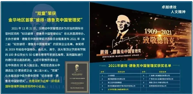 2003年開(kāi)始,雙童創(chuàng)新發(fā)展模式逐漸被社會(huì)所關(guān)注,眾多經(jīng)營(yíng)案例先后被中國(guó)管理案例共享中心、中小學(xué)教材和公務(wù)員考卷等收錄引用,并在2021年獲得管理界最權(quán)威的“彼得·德魯克管理獎(jiǎng)”。