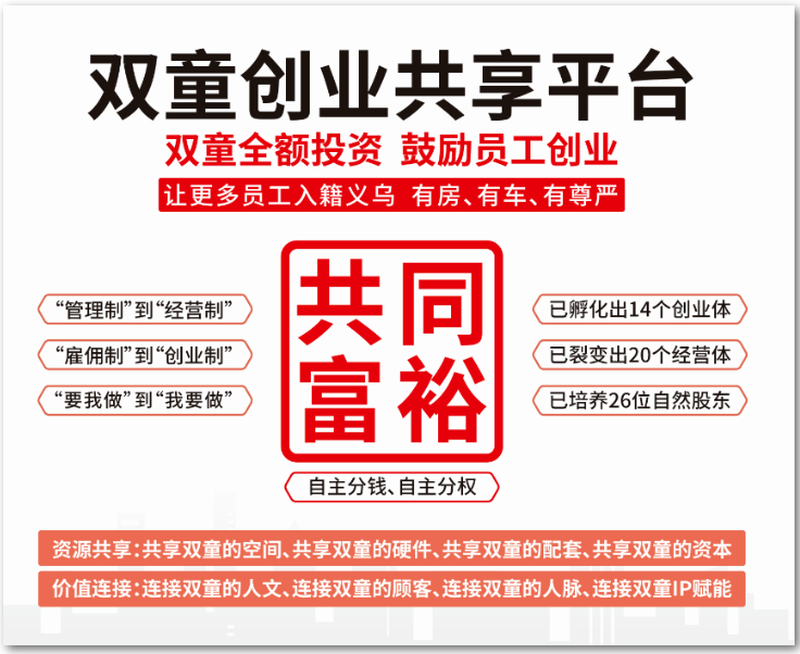 通過(guò)雙童商學(xué)院這一紐帶,自主制創(chuàng)業(yè)裂變機(jī)制也已經(jīng)走出了雙童,逐漸影響了許多義烏周邊的企業(yè)。