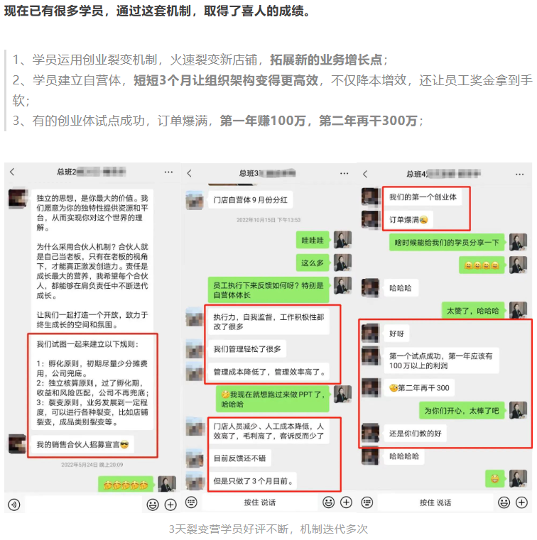看著學(xué)員們?cè)趯W(xué)完機(jī)制回去之后的可喜變化,讓我倍感欣慰,我知道自己終于打磨出一套完整、可復(fù)制的“創(chuàng)業(yè)裂變機(jī)制“。