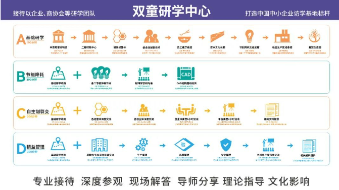 “雙童”第十創(chuàng)業(yè)體——雙童研學(xué)中心,于2023年3月成立。一直以來,“雙童”獨特的企業(yè)經(jīng)營理念,吸引了眾多社會關(guān)注,每年都有大量的社會組織和高校團(tuán)體等前來調(diào)研參觀。為更好地賦能,組建了雙童研學(xué)中心,系統(tǒng)化為更多對雙童模式感興趣的人們提供場景學(xué)習(xí)。