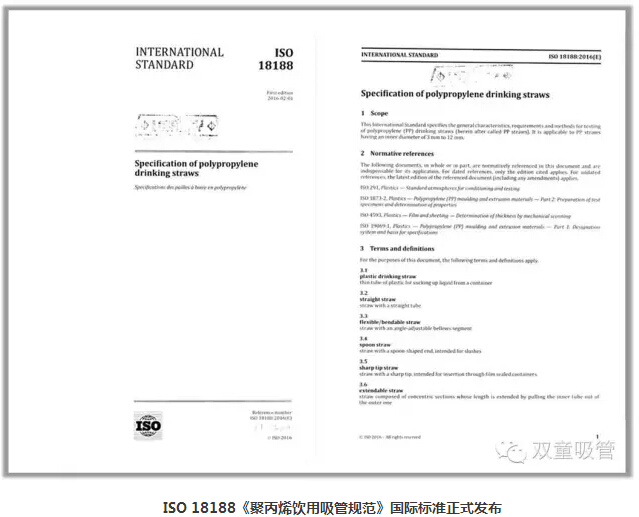 上周一,瑞士日內(nèi)瓦ISO國際標(biāo)準(zhǔn)化組織已正式向全球162個(gè)成員國發(fā)布了《聚丙烯飲用吸管規(guī)范》ISO國際標(biāo)準(zhǔn),而這一標(biāo)準(zhǔn)是由義烏市雙童日用品有限公司主導(dǎo)制定的。