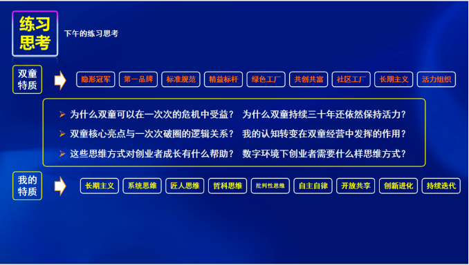 一千個(gè)人眼中有一千個(gè)哈姆雷特,36位同學(xué)來(lái)自各行各業(yè),帶著自己的經(jīng)驗(yàn)認(rèn)知,以及“開(kāi)門”思維,一齊就多個(gè)“雙童”案例的開(kāi)放式問(wèn)題進(jìn)行總結(jié)歸納,并探討各自企業(yè)復(fù)制經(jīng)驗(yàn)的可能性。