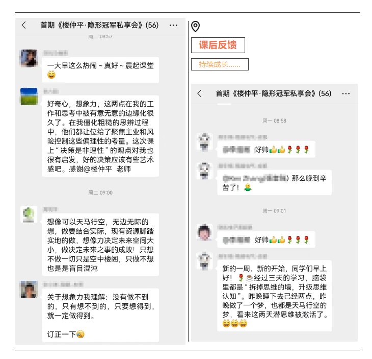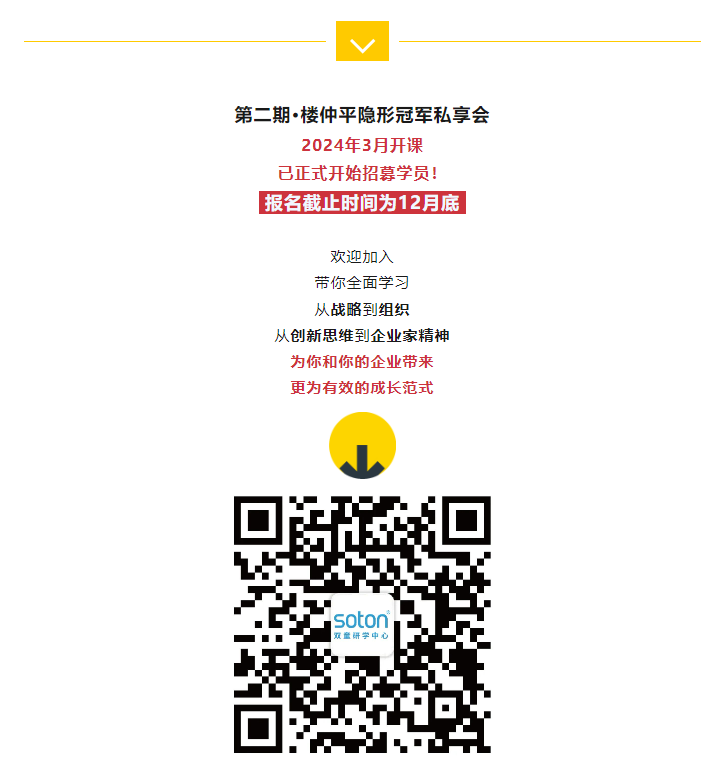 目前,樓仲平隱形冠軍私享會(huì)第一期已結(jié)束第一模塊的學(xué)習(xí),接下來(lái)繼續(xù)開(kāi)展6大模塊,主題分別為“破圈”、“取舍”、“進(jìn)化”、“案例”、“出發(fā)”、“開(kāi)悟”,一起期待吧!