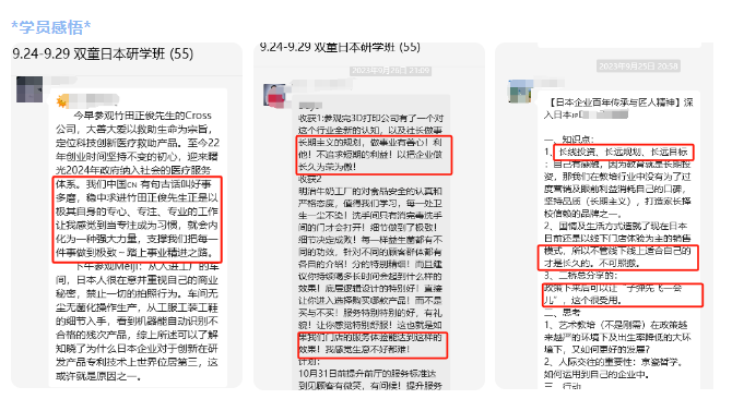 兩期日本企業(yè)游學(xué)之旅,很多學(xué)員都深受啟發(fā),在貫穿研學(xué)全程的巴士課堂上大家暢所欲言,分享所見(jiàn)所得所想。無(wú)論是從巴士課堂上的分享發(fā)言、還是從形成文字感悟來(lái)看,都能看出來(lái)大家收獲滿滿!