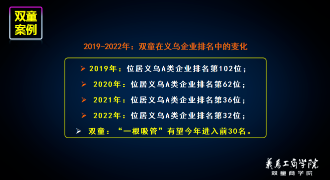 “雙童”目前已經(jīng)孵化出17個(gè)版塊的自主經(jīng)營(yíng)體,并裂變出15家員工創(chuàng)業(yè)體公司,并在2021年到2022年的兩年時(shí)間里,通過(guò)不斷挖掘“未被滿足的客戶需求”,使整體銷售額復(fù)合增長(zhǎng)了107.02%,相當(dāng)于用創(chuàng)業(yè)平臺(tái)“再造”了一個(gè)“雙童”。憑借此,“雙童”今年有望進(jìn)入義烏企業(yè)前30名。