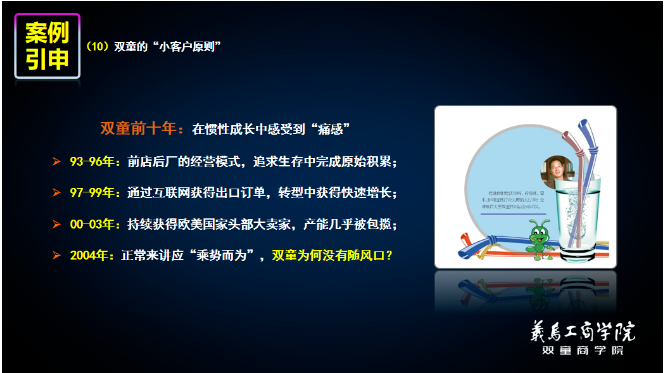 所以從2004年開(kāi)始,“雙童”開(kāi)始慢慢放棄“大客戶”,轉(zhuǎn)而推行“小客戶原則”。通過(guò)戰(zhàn)略轉(zhuǎn)變,“雙童”把原先每100根吸管僅8分錢的利潤(rùn),提升到了有20%以上利潤(rùn)率的提價(jià)空間,牢牢掌握了“雙童”經(jīng)營(yíng)的主動(dòng)權(quán)。