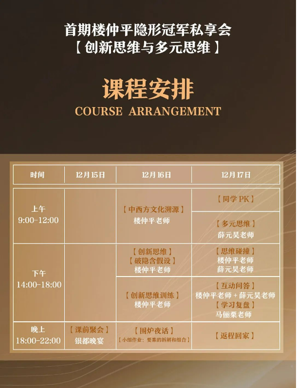 就在12月15日-17日,我們即將迎來首期《樓仲平·隱形冠軍私享會(huì)》第二模塊的學(xué)習(xí)征程,本模塊的主題是【創(chuàng)新思維】,關(guān)鍵詞為“破圈”!