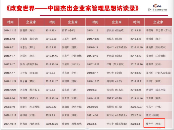 樓仲平老師在創(chuàng)業(yè)實(shí)踐中,持續(xù)20多年自學(xué)管理學(xué),積累了深厚的管理思想、實(shí)踐認(rèn)知和實(shí)戰(zhàn)經(jīng)驗(yàn),從一個(gè)挑貨郎擔(dān)的草根創(chuàng)業(yè)者成長為教育部認(rèn)證的中國優(yōu)秀創(chuàng)業(yè)導(dǎo)師,并被復(fù)旦大學(xué)東方管理研究院收錄到《改變世界-中國杰出企業(yè)家管理思想》的50位中國優(yōu)秀企業(yè)家之一。同時(shí)期,中國規(guī)模最大的財(cái)經(jīng)媒體頻道《第一財(cái)經(jīng)》,就此話題制作播出訪談專題片《樓仲平:順時(shí)而變》,將樓老師的創(chuàng)業(yè)精神傳遞給更多人。