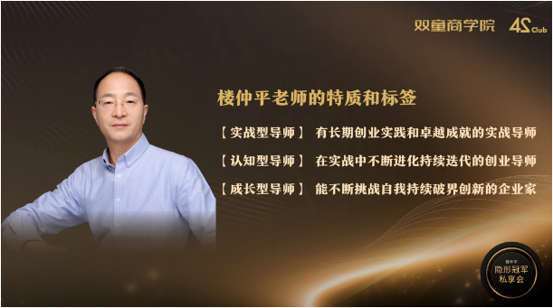 “樓仲平隱形冠軍私享會(huì)”是以樓仲平老師的名字作為背書的一個(gè)小范圍思想圈子,將成為他一生中最重要的思想載體,宗旨為推動(dòng)創(chuàng)業(yè)者不斷開門和破圈,成長為“隱形冠軍”。