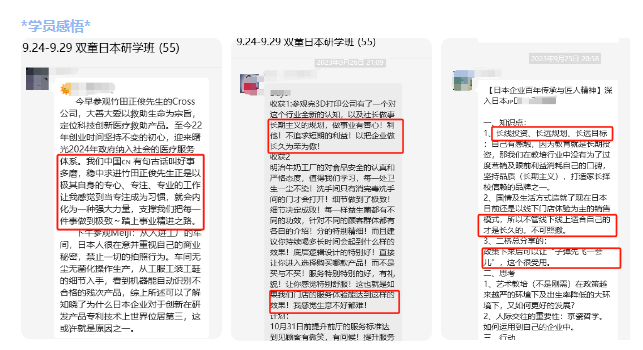 兩期日本企業(yè)游學之旅,很多學員都深受啟發(fā),在貫穿研學全程的巴士課堂上大家暢所欲言,分享所見所得所想。無論是從巴士課堂上的分享發(fā)言、還是從形成文字感悟來看,都能看出來大家收獲滿滿!