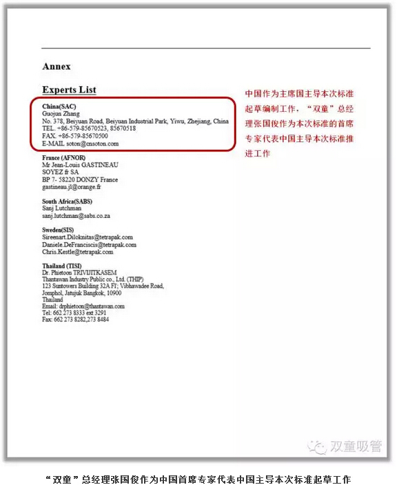 從2008年向ISO國際標(biāo)準(zhǔn)化組織提交ISO《聚丙烯飲用吸管》國際標(biāo)準(zhǔn)的起草申請(qǐng)書,到2016年該組織正式向全球162個(gè)成員國下發(fā)ISO國際標(biāo)準(zhǔn)文本,“雙童”整整努力了9年,先后在6個(gè)國家召開了多次專家討論會(huì),最終“打敗”包括“日本標(biāo)準(zhǔn)”在內(nèi)的全球眾多吸管產(chǎn)品標(biāo)準(zhǔn),拿下“桂冠”,讓全球吸管行業(yè)向中國標(biāo)準(zhǔn)看齊。