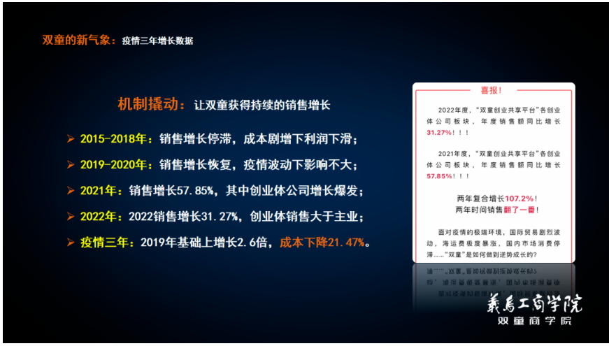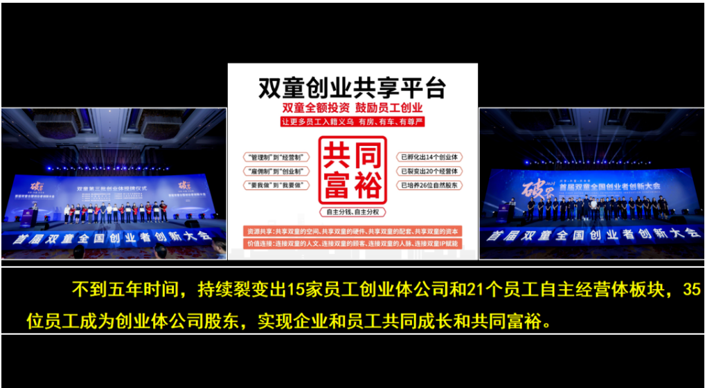 2018年開始,第二創(chuàng)業(yè)體的“雙童進(jìn)出口”和第三創(chuàng)業(yè)體的“義童國際貿(mào)易”相繼成立,成為我們國際貿(mào)易板塊的主力軍。2020年6月,第五創(chuàng)業(yè)體的“雙童商學(xué)院”成立,開啟了公司創(chuàng)業(yè)教育的新板塊;第六創(chuàng)業(yè)體、第七創(chuàng)業(yè)體、第八創(chuàng)業(yè)體、第九創(chuàng)業(yè)體……,不到五年時(shí)間,持續(xù)裂變出15家員工創(chuàng)業(yè)體公司,和21位員工自主經(jīng)營體板塊,35位員工在公司獲得了創(chuàng)業(yè)的機(jī)會(huì),成為了真正創(chuàng)業(yè)公司的創(chuàng)始股東,推動(dòng)員工實(shí)現(xiàn)從打工到老板的華麗轉(zhuǎn)身,實(shí)現(xiàn)企業(yè)和員工的共同成長(zhǎng)和共同富裕。在過去的疫情三年時(shí)間里,我們依然保持2.6倍的快速增長(zhǎng),公司在義烏企業(yè)的綜合排名也從2019年的92位,一路上揚(yáng)進(jìn)入到去年的第32位。員工創(chuàng)業(yè)板塊的創(chuàng)新業(yè)務(wù),在短短五年時(shí)間里再造了兩個(gè)雙童。
