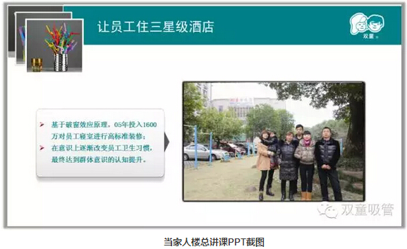 當家人樓總坦言“雙童”其實很簡單,做企業(yè)的人就應該實實在在的把企業(yè)做好,敬天愛人,回歸商業(yè)本質(zhì)!通過硬件的提升、學習會等形式潛移默化地影響員工,通過這樣的教育改變員工的意識形態(tài)。