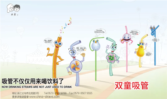 所以早在2004年,“雙童”就打破了“吸管就是喝飲料的”隱含假設,并通過要素拆解和組合去獲得一個“新組合”,從吸管單一的“喝水”功能向情感化、體驗化和娛樂化延伸,使產(chǎn)品售價和附加值都得到成倍增長,徹底讓“一根吸管”從“不可能”變成了“可能”。在2005年的戶外廣告和會刊封底廣告中