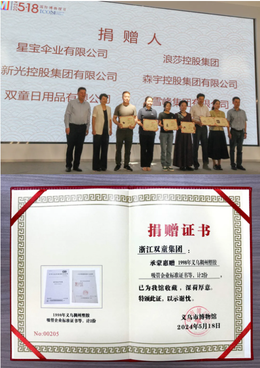 “雙童”作為義烏市場(chǎng)發(fā)展的參與者與見(jiàn)證者,由雙童第五創(chuàng)業(yè)體總經(jīng)理周上代表公司為新館“添磚加瓦”,捐贈(zèng)兩項(xiàng)標(biāo)準(zhǔn)原件,即:1998年,首件吸管行業(yè)企業(yè)標(biāo)準(zhǔn);2009年,金華市首件國(guó)家標(biāo)準(zhǔn)-《聚丙烯飲用吸管》國(guó)家標(biāo)準(zhǔn)。這兩件標(biāo)準(zhǔn),也代表了義烏的中小企業(yè)在發(fā)展過(guò)程中對(duì)標(biāo)準(zhǔn)化、規(guī)范化的追求!