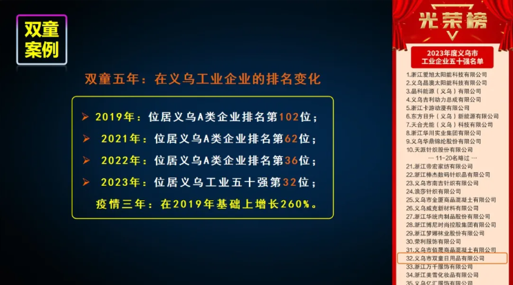 2023年,平臺整體增長35.24%;平臺稅收增長23.30%,成功登榜“納稅千萬元以上工業(yè)企業(yè)”和“義烏市工業(yè)企業(yè)五十強”!