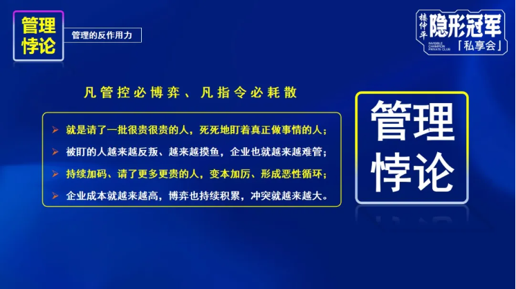 但是根據(jù)管理悖論,“凡管控必博弈,凡指令必耗散”,企業(yè)經(jīng)營真正的危險(xiǎn)更多來源于內(nèi)部的耗散;企業(yè)管理真正的成本來源于成員之間的博弈,所以,當(dāng)企業(yè)有一定規(guī)模之后,則要用治理的“疏”替代管理的“堵”,需要在滿足人性訴求下,對管理的本身進(jìn)行結(jié)構(gòu)優(yōu)化和激勵。
