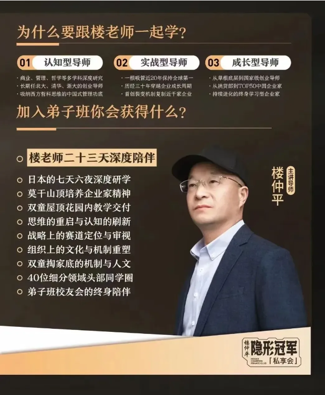 歡迎您走進(jìn)「樓仲平·弟子班」課堂,在樓仲平老師的陪伴下,學(xué)習(xí)借鑒雙童30年的成功的經(jīng)驗(yàn)積累,助力您在創(chuàng)業(yè)路上更加順?biāo)?,在遇到抉擇時(shí)能做出更加理性的判斷!