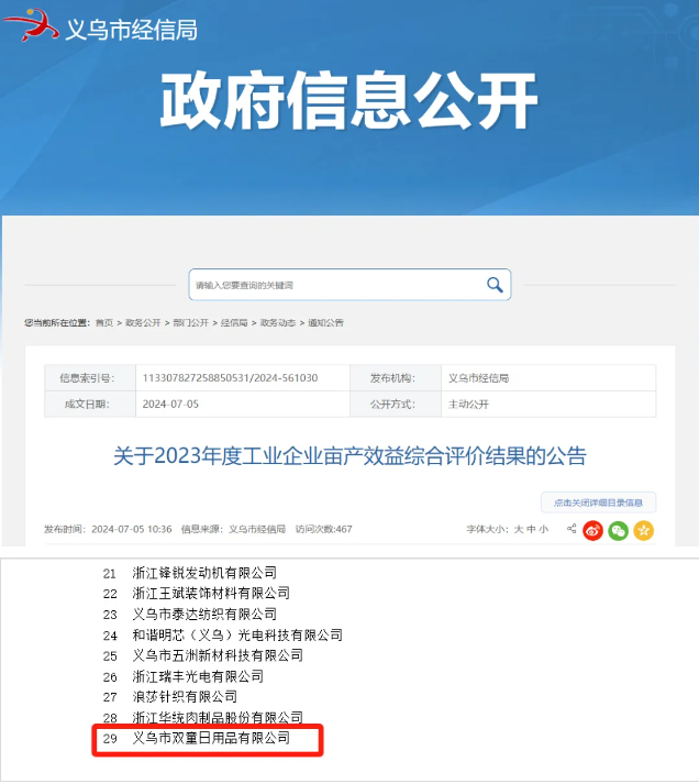 昨日,2023年度義烏工業(yè)企業(yè)畝產(chǎn)效益綜合評價結(jié)果正式出爐,“雙童”再次獲評A類企業(yè)!至此,“雙童”已連續(xù)11年榮登畝均效益“英雄榜”!