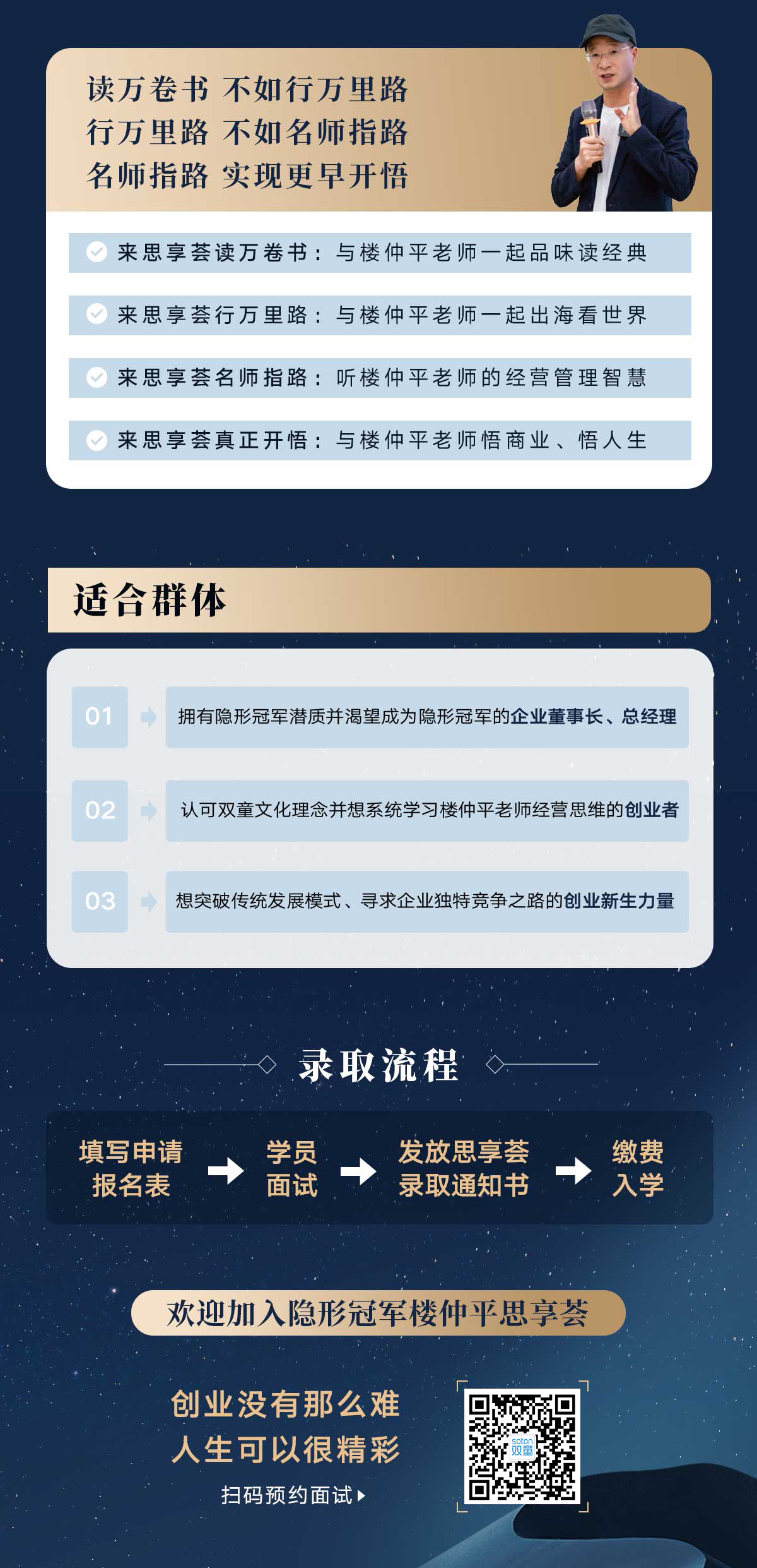 如果你是創(chuàng)業(yè)者、學習者、思想者,希望在經(jīng)營領域有自己的思考和洞察,那么《隱形冠軍樓仲平思享薈》就是為你量身定制,今年最后一期招生,一班只招40位同學,名額所剩不多,抓緊機會哦!
